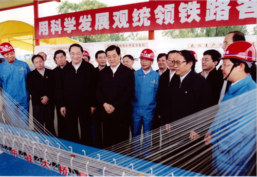 2005年8月22日上午,中共中央總書(shū)記、國(guó)家主席、中央軍委主席胡錦濤同隨行的中共中央政治局候補(bǔ)委員、中央書(shū)記處書(shū)記、中央辦公廳主任王剛,在中共中央政治局委員、湖北省委書(shū)記俞正聲,湖北省省長(zhǎng)羅清泉等陪同下,考察了正在建設(shè)中的武漢天興洲公鐵兩用長(zhǎng)江大橋工程,對(duì)鐵路建設(shè)作出重要指示。胡總書(shū)記指出,武廣鐵路客運(yùn)專(zhuān)線和武漢天興洲大橋是中國(guó)鐵路建設(shè)史上新的里程碑。這條鐵路線的建設(shè)標(biāo)志著中國(guó)鐵路客運(yùn)專(zhuān)線建設(shè)的開(kāi)始,今后要建設(shè)更多的鐵路客運(yùn)專(zhuān)線。一定要把武廣客運(yùn)專(zhuān)線和天興洲大橋這個(gè)我國(guó)鐵路建設(shè)史上新的里程碑工程建設(shè)好。