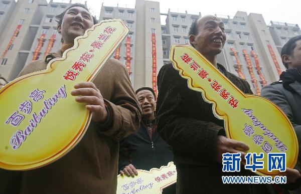 這是首批住戶代表在武漢市最大的保障性住房項(xiàng)目——百步亭社區(qū)悅秀苑、景蘭苑交房?jī)x式上領(lǐng)到鑰匙(2009年12月8日攝)。 新華社發(fā)