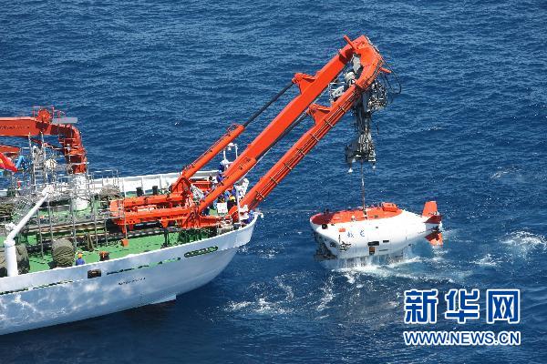 這是“蛟龍?zhí)枴鄙詈]d人潛水器于2010年7月在中國南海執(zhí)行一次成功下潛后出水。 新華社發(fā)(中國大洋協(xié)會供圖)