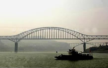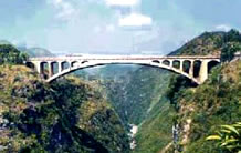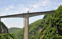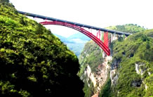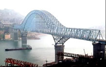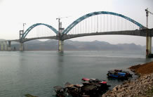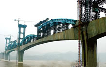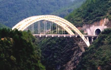 湖北宜萬鐵路野三河大橋位于湖北省恩施州建始縣與巴東縣交界處,它是一座主跨為124米不對(duì)稱雙線平行雙肋中式復(fù)合鋼管混凝土桁架坡拱橋,由中承式拱橋和下承式拱橋兩部分組成,這種不對(duì)稱坡拱橋在國內(nèi)尚屬首例。該橋由湖北省交通規(guī)劃設(shè)計(jì)院設(shè)計(jì),于2006年3月份開工,2007年1月成功合龍。