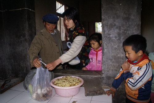 圖為:早晨,丁潔將學(xué)生帶的土豆、玉米面、蒜頭等送到“愛(ài)心食堂”(由社會(huì)愛(ài)心人士捐建的),交給食堂師傅給孩子們做中餐